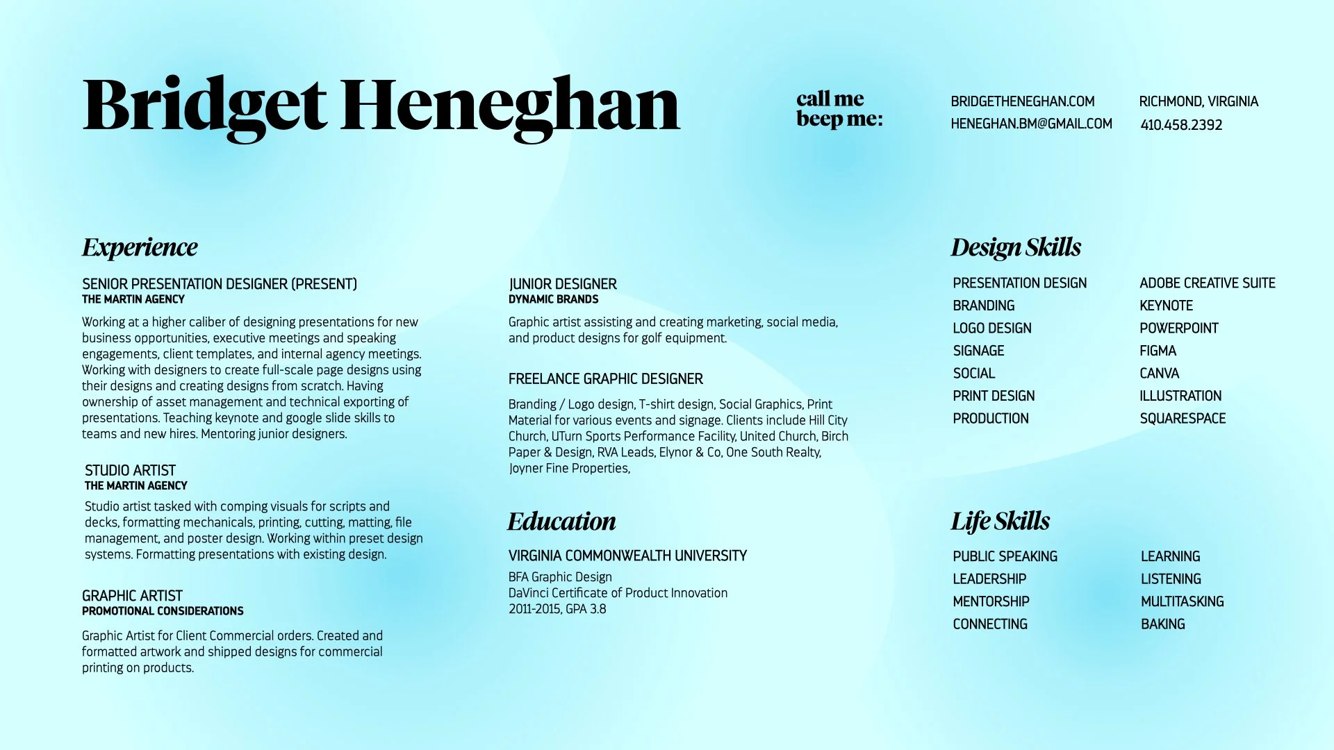 Software Skills: Adobe Illustrator, Indesign, Photoshop, Keynote, Google Slides, Microsoft Powerpoint, Adobe Acrobat, Wordpress, Squarespace, Figma, Canva